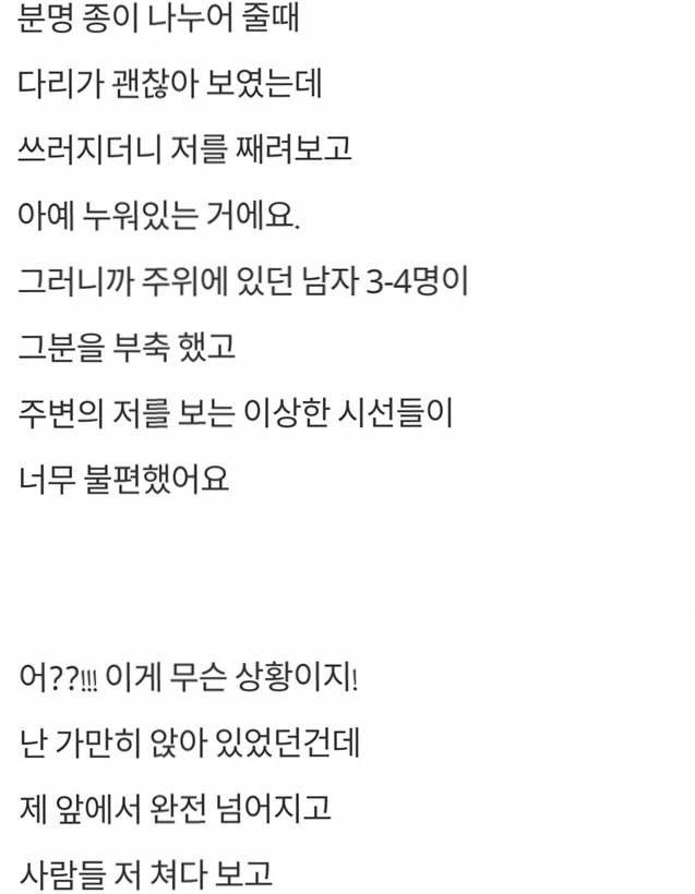 이 여성은 돈을 구걸하는 앵벌이 아저씨가 자신이 발을 건 양 바로 앞에서 일부러 넘어졌다고 밝혔다.