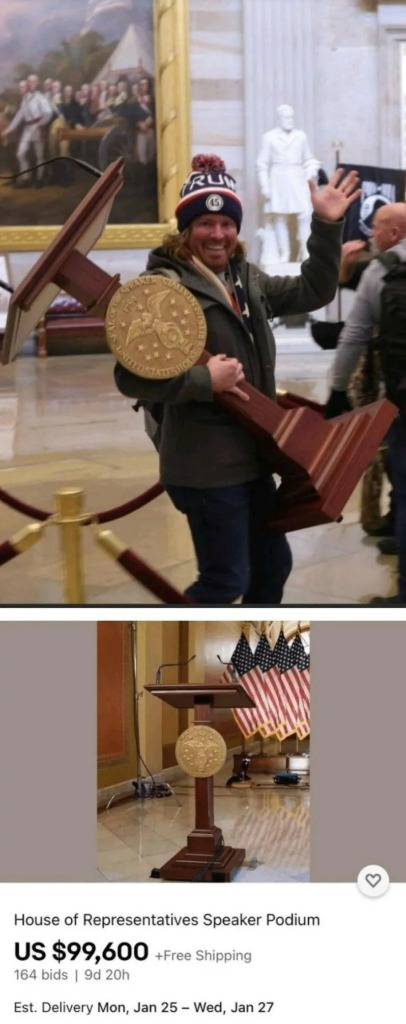 바로 트럼프 추종자가 의회에서 훔쳐간 미국 의회의 단상이 의회에 올라온 것입니다. 어떻게 저걸 팔 생각을 했을까요?