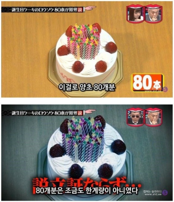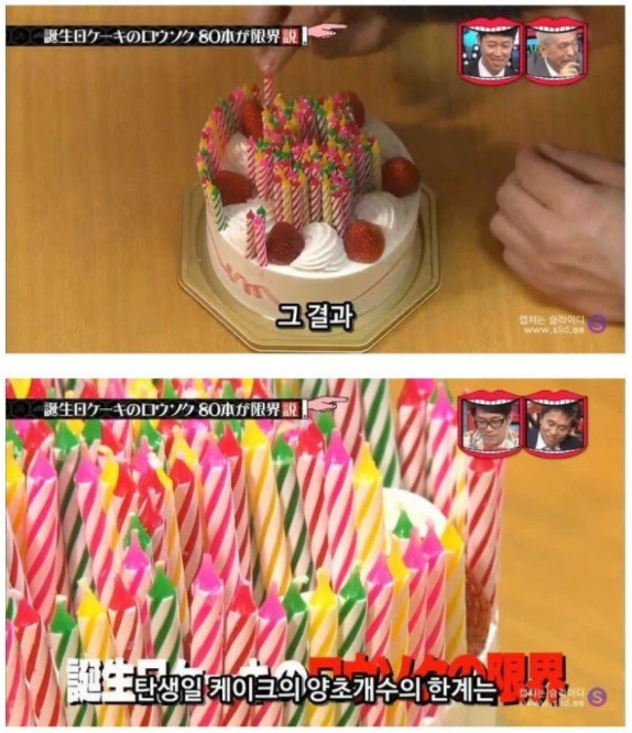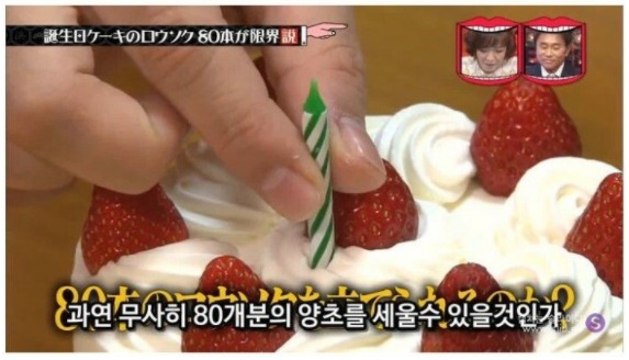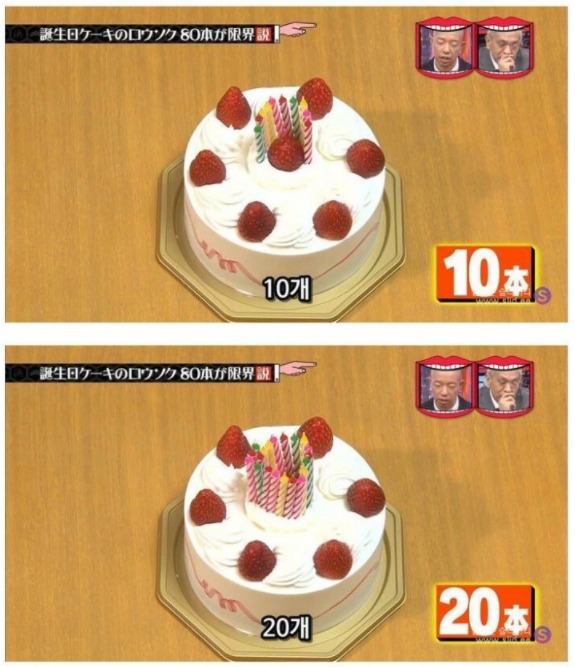 간혹 일본사람들 사이에서 나오는 질문 중 하나로 "케이크에 꽂을 수 있는 초는 최대 80개다?" 라는 문제를 해결하기 위해 일본의 한 예능프로그램에서 발벗고 나섰다.