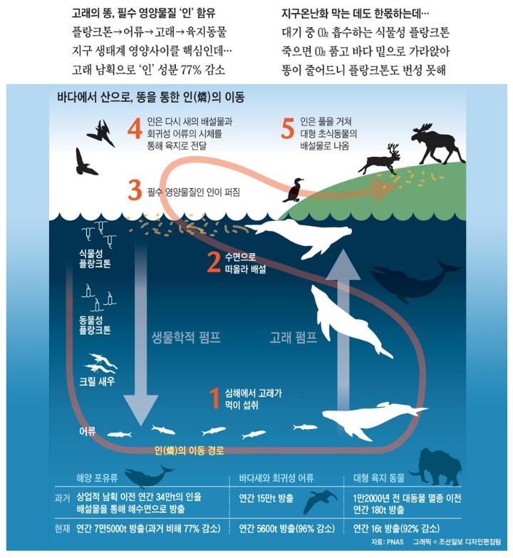 고래의 똥으로 번성하는 식물성 플랑크톤의 몸을 이루는 탄소는 대기 중의 이산화탄소에서 온 거야 플랑크톤이 죽으면 바다 밑으로 가라앉는데 결국 대기 중의 이산화탄소가 플랑크톤의 몸에 갇혀 가라앉힌다. 지구온난화의 주범인 대기 중 이산화탄소 상당량 바다로 들어가는 것이다.