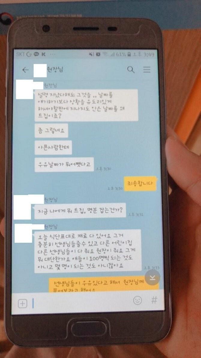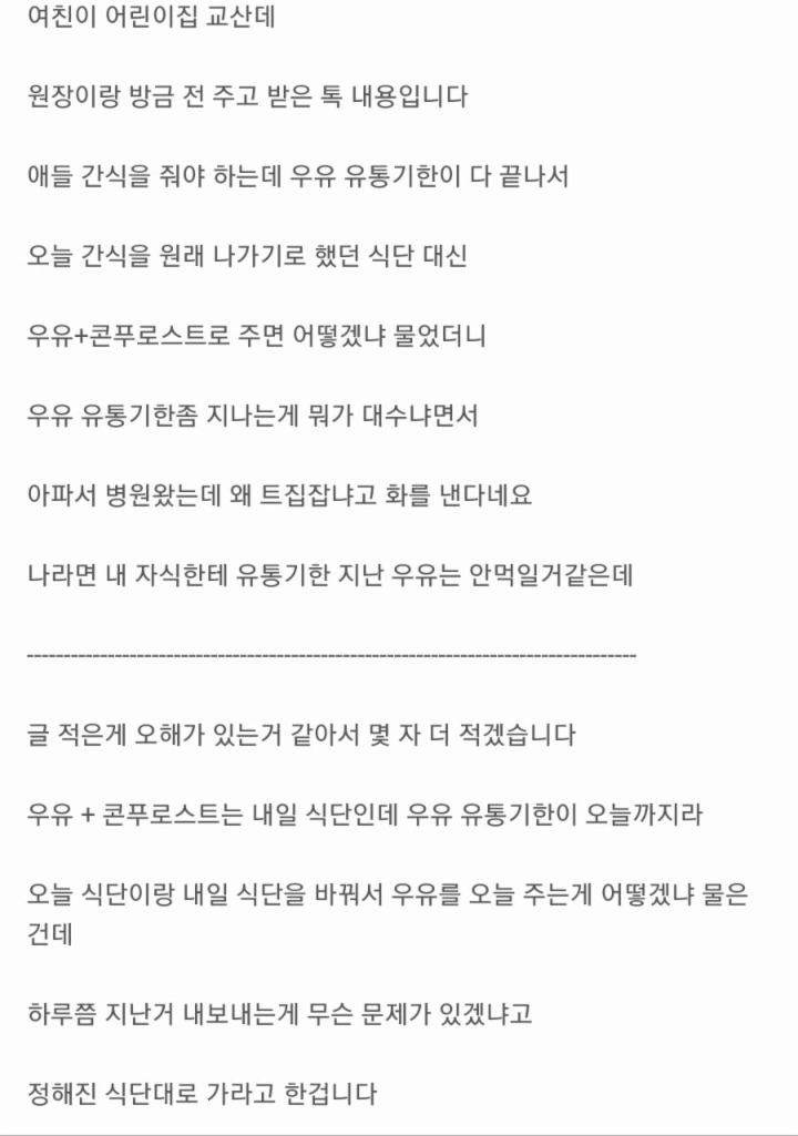 하지만 이 사실을 알게된 교사는 원장에게 우유 유통기한을 이유로 순서를 바꾸자고 제안했다.