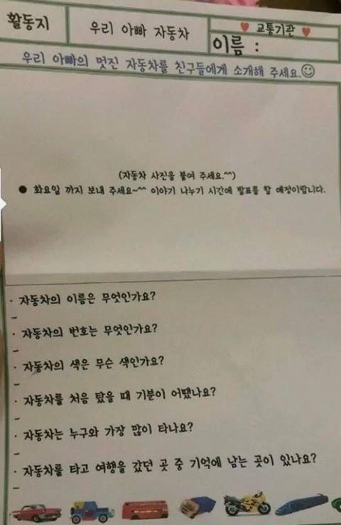 이 숙제는 아빠의 자동차에 대해 작성해 오는 것이었다.