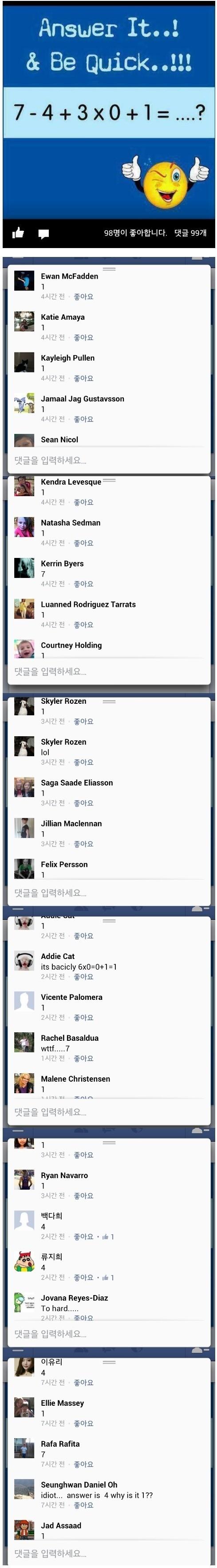 페이스북에서 한국인만 맞춘 수학문제 한국인들의 수학 능력을 알 수 있던 한 퀴즈가 화제다. 이 퀴즈는 페이스북에 게재되어 답에 대해 많은 댓글이 달렸다. 대다수의 외국인들은 틀린 답을 댓글로 달았지만 한국인들은 올바른 정답을 댓글로 남겼다. 정답은 4
