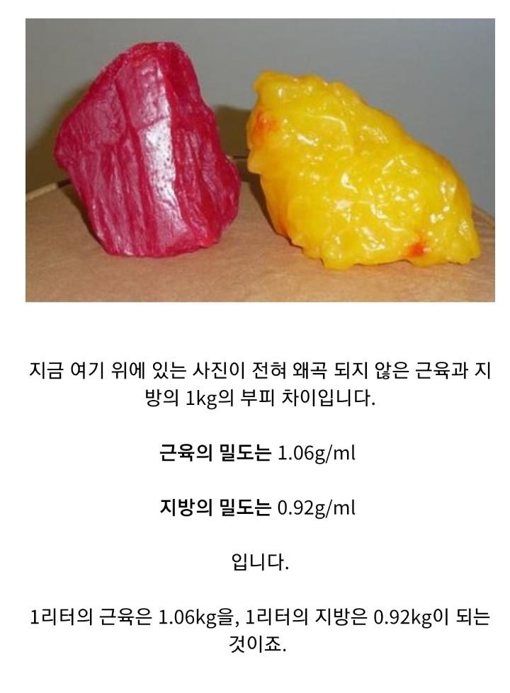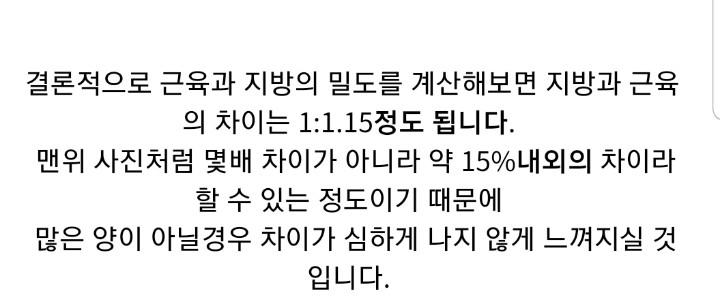 지방과 근육의 부피차이 출처: 커뮤니티 캡처 (이하동일) 지방과 근육의 부피 차이는 어떻게 될까? 결과적으로 크게 차이가 나지 않는다이다. 다음 설명을 통해 지방과 근육의 부피 차이를 수치로 확인해보자.