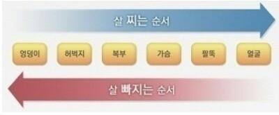 살이 찌고 빠지는 순서 살이 가장 먼저 찌는 부위 그리고 살이 가장 먼저 빠지는 부위는 정 반대이다. 살이 가장 먼저 찌는 순서는 엉덩이, 허벅지, 복부, 가슴, 팔뚝, 얼굴 순이다. 살이 가장 먼저 빠지는 순서의 정반대로 얼굴, 팔뚝, 가슴, 복부, 허벅지, 엉덩이 순이다. 다이어트를 할 때 원하는 부위를 빼고 싶다면 이 순서를 참고해야 한다. 가장 늦게 빠지는 부위일 수록 오랜 시간이 소요될 수 있다.