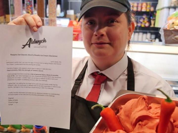 세상에서 가장 매운 아이스크림 고추의 매운정도를 나타내는 스코빌척도로 무려156만9300SHU 청량고추보다 무려 700배 매운고추라고 잘못하면 사망까지할 수 있어 먹기 전 각서를 받는다고 한다.