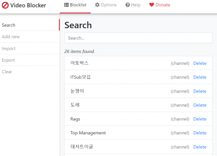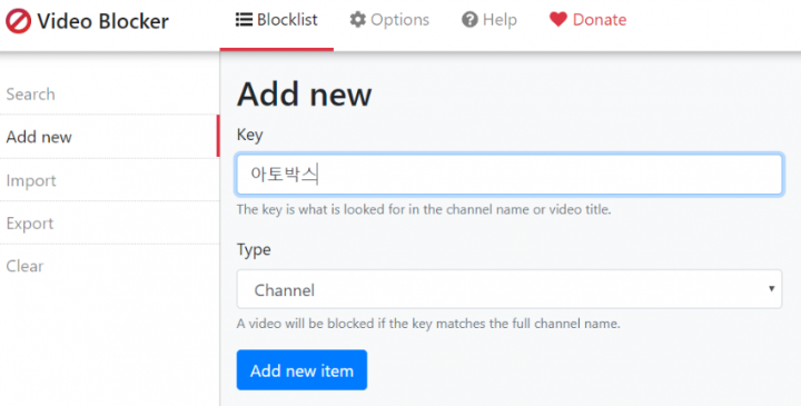유튜브 특정 채널 블럭 하는 확실한 방법 1. 구글 크롬에 애드온 "Video Blocker" 설치! 2. Block list > Add new에서 차단하고 싶은 채널 입력 3. 차단완료하면 다시는 유튜브에서 안 볼 수 있음. 유튜브에서 영상 관심없음 or 신고하기 해도 검색하다보면 나오기 때문에 이 방법이 제일 확실!