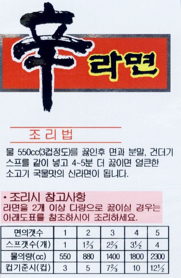 신라면 조립법에 의하면 라면 갯수마다 물을 넣는 양과 스프량이 다르다고 한다.