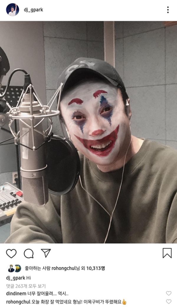 박명수의 조커 분장을 본 노홍철의 반응 박명수는 이날 인스타그램에 조커 분장을 한 사진을 올렸다. 노홍철은 'rohongchul' 아이디로 "오늘 화장 잘 먹었네요 형님! 이목구비가 뚜렷해요"라고 답글을 남겼다.