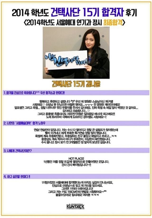 이후 각종 커뮤니티에서 김씨에 대한 제보가 이어졌고, 김씨는 2014년도 서울예술대학교 연기과에 합격한 사실이 밝혀졌다.
