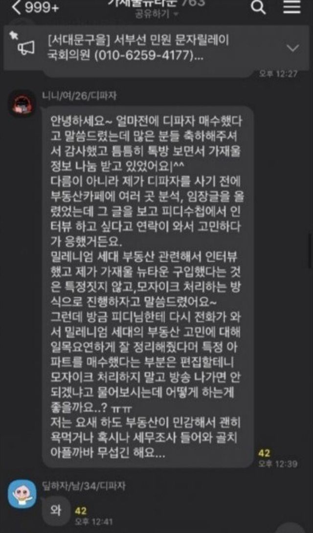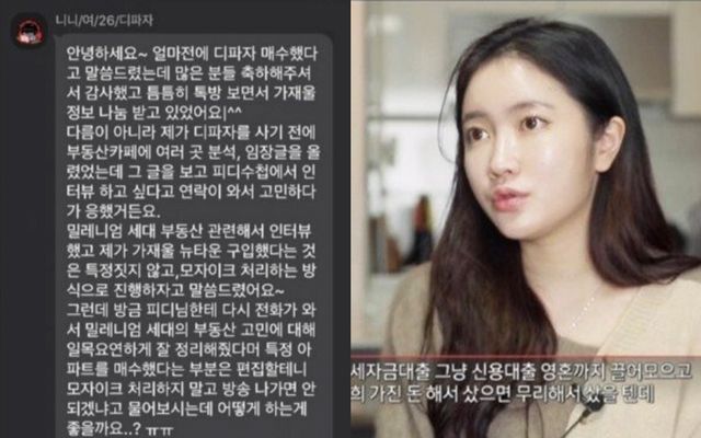 김씨는 가재울뉴타운 오픈채팅방에서 "피디수첩 피디가 밀레니얼 세대의 부동산 고민에 대해 일목요연하게 잘 정리했다며 아파트 매수한 부분은 편집할테니 모자이크 처리하지 말고 방송 나가면 안되겠냐고 물어봤다"고 했다.