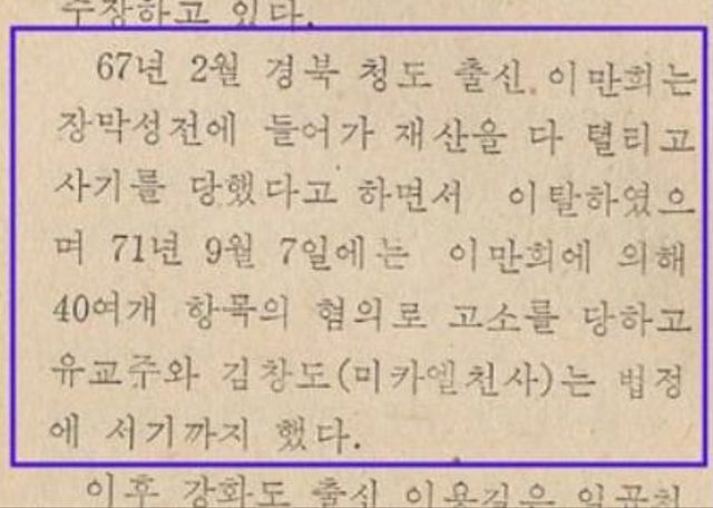 30대의 나이로 10대 교주를 열심히 따랐던 이만희는 유 씨가 횡령·배임 등으로 징역을 선고받자 1971년 "재산을 다 털리고 사기를 당했다"면서 교주 유 씨를 40여개 항목의 혐의로 고소하면서 이탈한다.