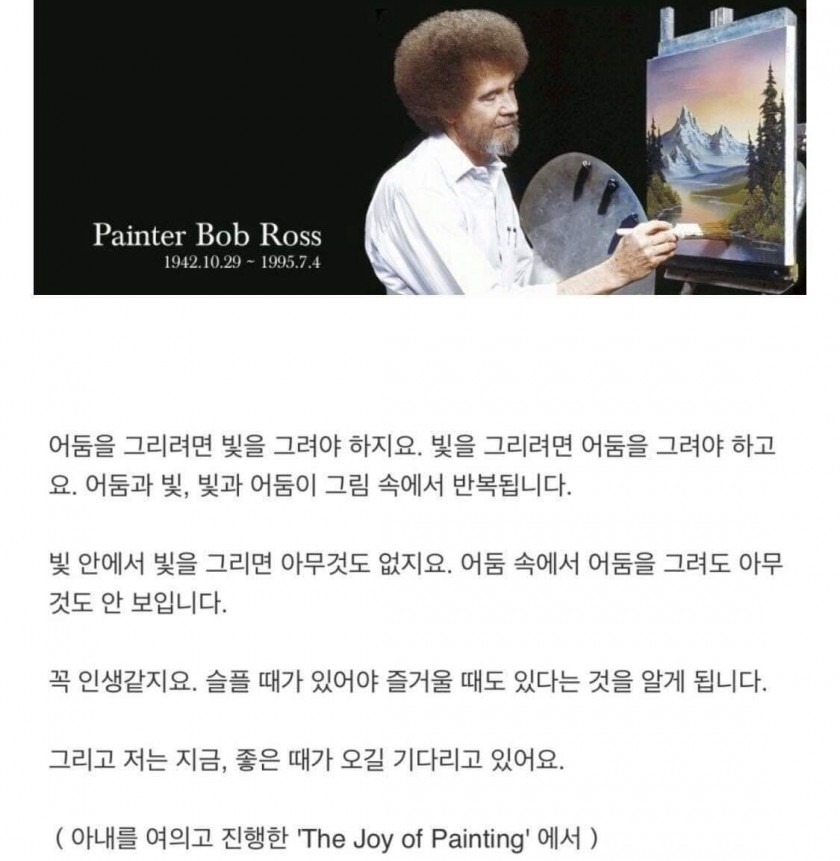 우리에게 참 쉽죠? 아저씨로 더 유명한 화가 밥 로스씨 일명 밥 아저씨로 불리는 이 아저씨가 우리에게남긴 명언이 다시 회자되며 누리꾼들의 큰 공감을 사고있습니다.