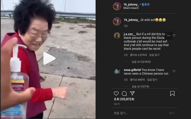미국의 한 흑인 누리꾼은 자신의 인스타그램에 동양인 할머니에게 "바이러스다"라고 외치며, 할머니에게 손세정제를 뿌리는 영상을 게재했다.