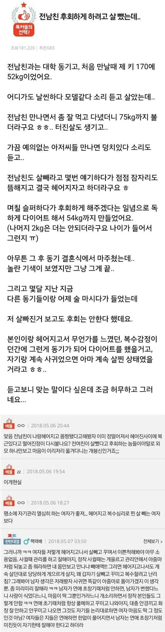 [서울=막이슈] 한 온라인 커뮤니티에 전남친에게 이별 통보를 받은 뒤 독하게 다이어트한 A씨의 사연이 화제다.