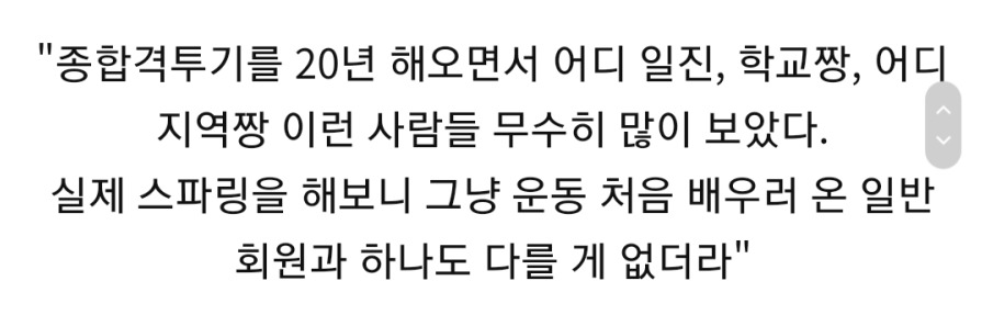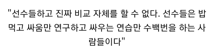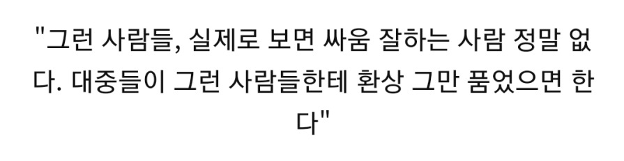 큰소리 뻥뻥 치던 그런 사람들도 직접 겨뤄보면 일반인과 다를 게 없다며 "일반 사람들이 그런 사람들에 대한 환상을 접었으면 한다"고 말했다.