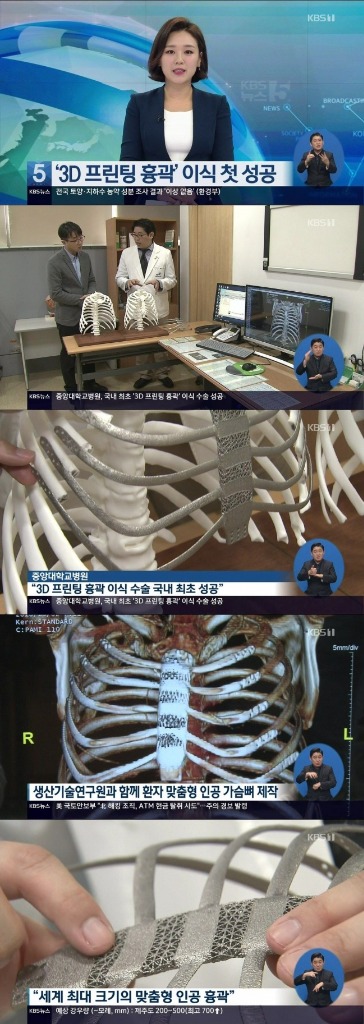 3D 프린터를 사용해 인공 흉곽을 만들어 사람에게 이식을 하는 수술을 성공한 것입니다. 이제 몸의 뼈를 전부 인공물로 바꿀 수도 있을 것 같네요.