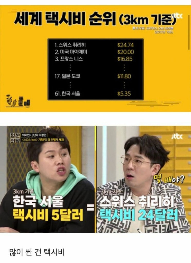 가장 비싼 것은 아무래도 빵이었습니다. 확실히 빵집에 들어가면 빵들이 참 비싸죠, 반대로 가장 싼 것은 택시비였습니다. 우리는 택시비가 너무 비싸다고 많이 호소하지만 세계적인 기준에 비하면 많이 싸다고 하네요.