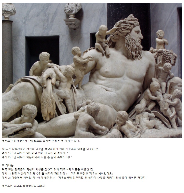 실제로 제우스는 바람을 피우는 신이 아니라 권력자들의 자기 합리화에 희생당한 신이었을지도 모르겠습니다.