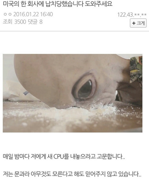 <자신이 외계인인데, CPU를 만드는 인텔에 납치 되었다고 한다.>