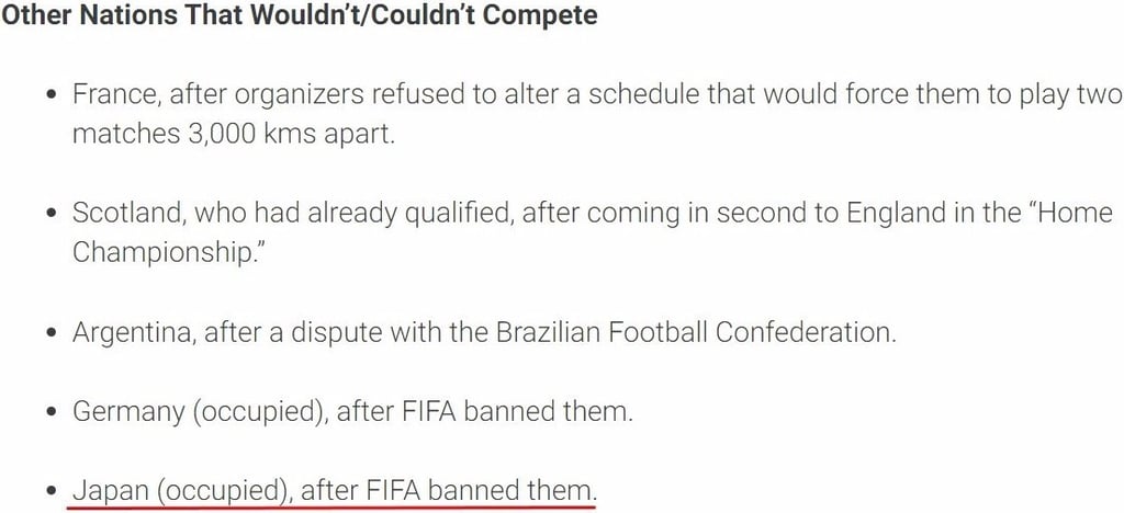 그것은 바로 1950년 브라질 월드컵 출전 금지 이유는 아시아 유일무이한 전범국이기 때문.