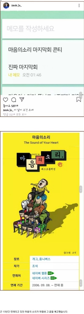 이런 네이버 웹툰이 커질 수 있기 기반을 다진 것은 단연 마음의 소리라고 할 수 있죠. 2006년 연재를 시작해 15년간 화요일 웹툰 상위권을 차지하던 마음의 소리가 드디어 막을 내린다고 합니다.