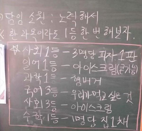 칠판에는 사회, 일어, 과학, 국어, 수학 순으로 포상 조건을 걸었다고 하며 제일 마지막의 수학선생님이 집 1채라는 파격 포상이 적혀있다.