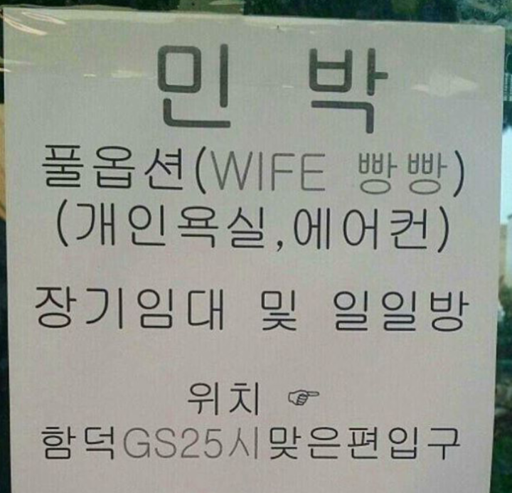 아내 몸매 자랑하는 민박집.jpg 한 인터넷 커뮤니티에 '난데없이 와이프 몸매 자랑'이라는 게시글이 네티즌들의 웃음을 자아내고 있다. 게시자는 한 장의 사진을 등록하였다. 사진에는 제주도로 보이는 한 민박집의 광고가 찍혀있는데 'WIFE 빵빵'이라는 오타가 적혀져있다. 와이파이를 와이프로 잘못 적은 것이와이프 몸매 자랑이라고 한 것이다. 아래 사진을 직접 확인해보자. 출처: 인터넷커뮤니티 캡쳐