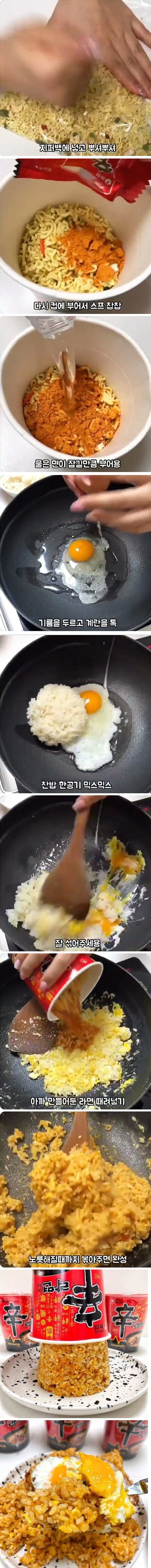 이후 팬에 계란과 찬밥을 섞어서 볶음밥을 만든다. 밥이 어느 정도 익었을 때 라면을 넣고 노릇해질때까지 볶아준다. 반숙 계란후라이를 얹어 먹으면 금상첨화.