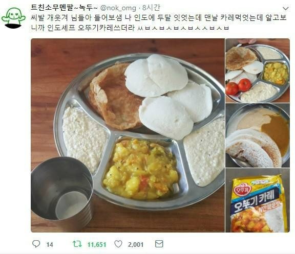 인도에서 두 달간 맛있게 먹은 카레가 알고보니 오뚜기 분말 카레였다고 합니다. 거의 원효대사 해골물이네요.