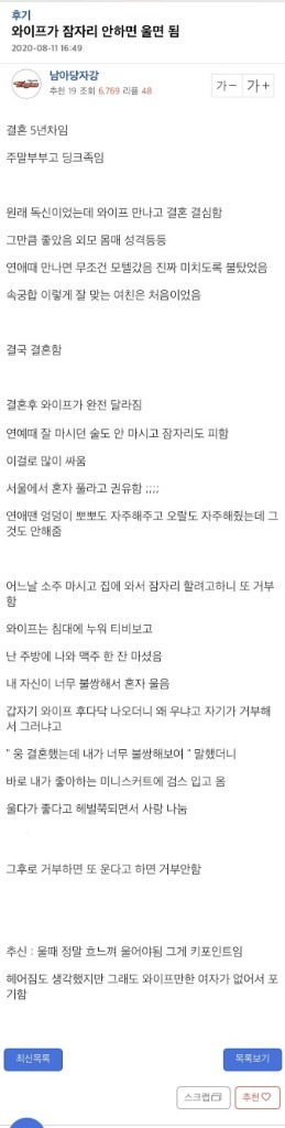 보통은 나이가 들면서 체력이 부족해진 남편이 먼저 부부관계에 소홀해졌다는 고민이 자주 올라오지만 반대로 여자 쪽에서 먼저 부부관계에 단절을 호소하는 경우도 있습니다.