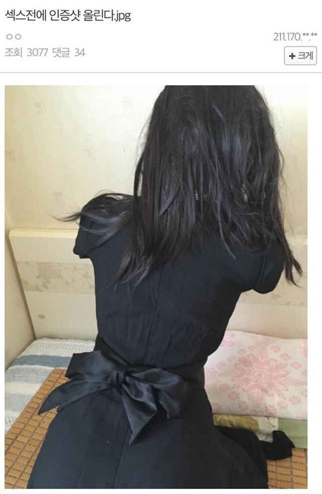 한 온라인 커뮤니티에 '섹스 전에 인증샷 올린다'는 게시글이 누리꾼들의 비난을 받고 있다. 해당 글을 게시한 글쓴이는 "섹스 전에 인증샷 올린다"며 긴 머리 여성의 뒷모습을 찍은 사진을 게시했다.