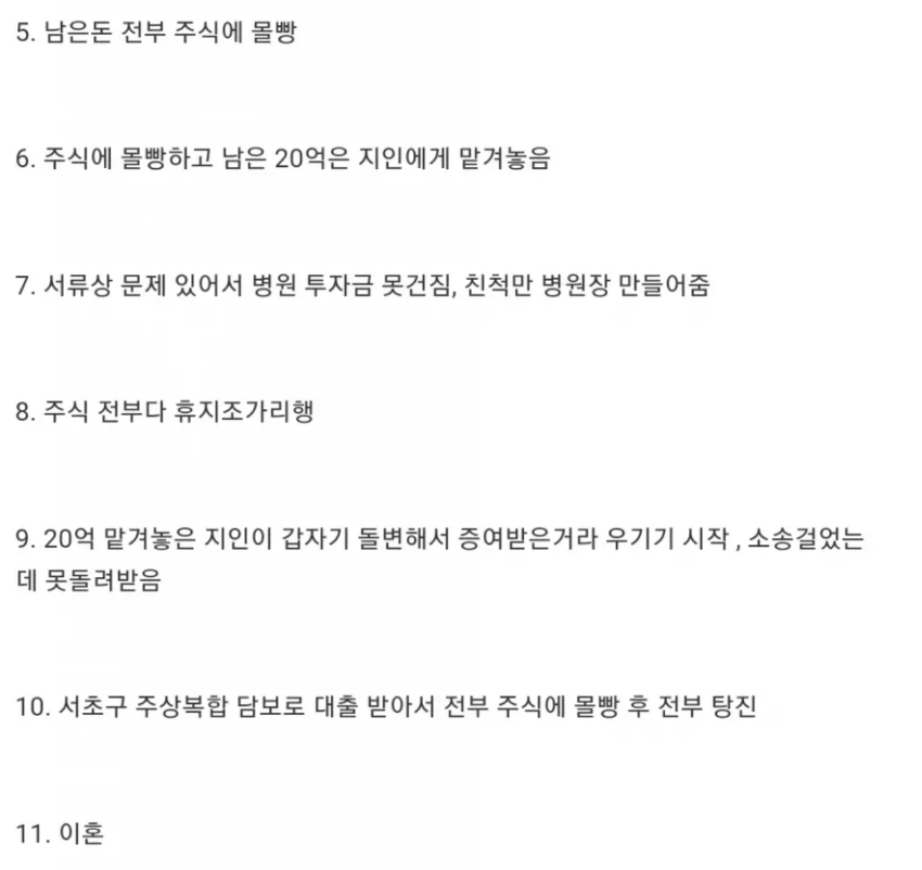 그는 아파트 구매 등을 제외하고는 전부 무계획적인 투자와 증여로 돈을 날려먹고 결국 전 재산을 탕진 후 이혼까지 당했다고 합니다. 돈 귀신에게 잡아먹혔다는 말이 이럴 때 쓰는 말이 아닐까요?