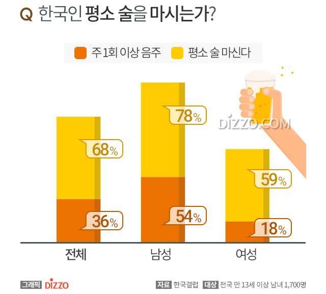 평소 술을 마시는지 물은 결과 전체 응답자의 68%가 '마신다', 32%는 '전혀 마시지 않는다'고 답했다. 성별 음주자 비율은 남성 78%, 여성 59%가 술을 마시는 것으로 나타났다. 주 1회 이상 음주자는 전체 응답자의 36%를 차지했으며, 성별로는 남성 54%, 여성 18%였다.