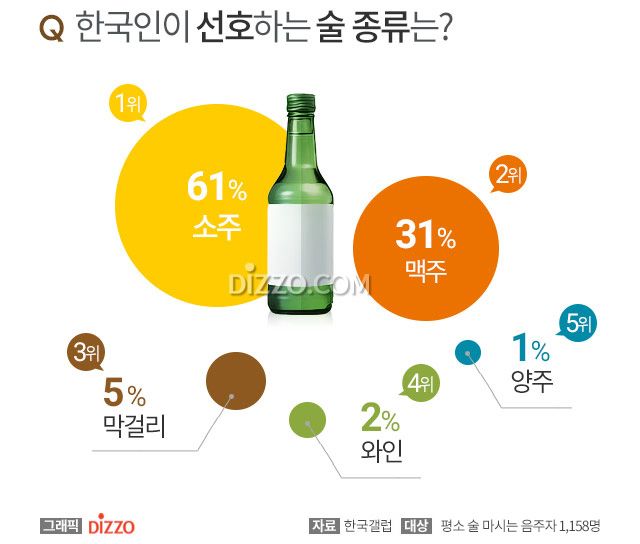 평소 술 마시는 한국인이 가장 좋아하는 술 종류로는 응답자의 61%가 '소주'를 선택했고, 그다음은 '맥주' 31%, '막걸리' 5%, '와인' 2%, '양주' 1% 순이었다. 남성은 소주파(소주 75%, 맥주 18%)가 절대다수지만, 여성은 맥주파(소주 41%, 맥주 49%)가 좀 더 많았다.