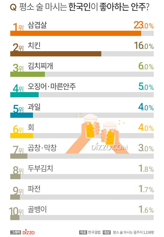 평소 술 마시는 한국인이 가장 좋아하는 안주 1위는 '삼겹살'로 응답자의 23%가 꼽았다. 2위는 '치킨' 16%였다.