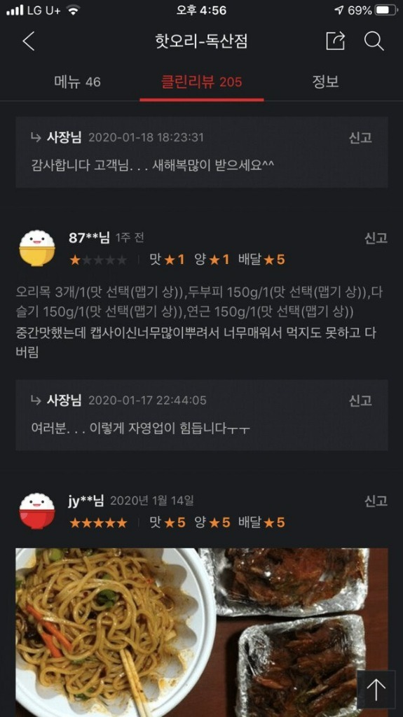 자신이 중간 맛을 선택했지만 캡사이신을 너무 많이 뿌려서 너무 매워 먹지도 못했다고 별점을 낮게 준 고객, 여기까지는 아무런 문제가 없어 보인다.